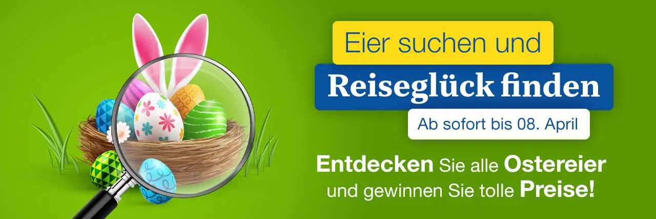 Damit Sie nicht wahlos auf unserer Website stöbern müssen, geben wir Ihnen an dieser Stelle bereits einen ersten Hinweis: Alle Ostereier, die wir für Sie versteckt haben, finden Sie in der Reiseauswahl, die wir unten für Sie unten zusammengestellt haben ... Es lohnt sich demnach, sich intensiv mit genau diesen Reisen auseinanderzusetzen!