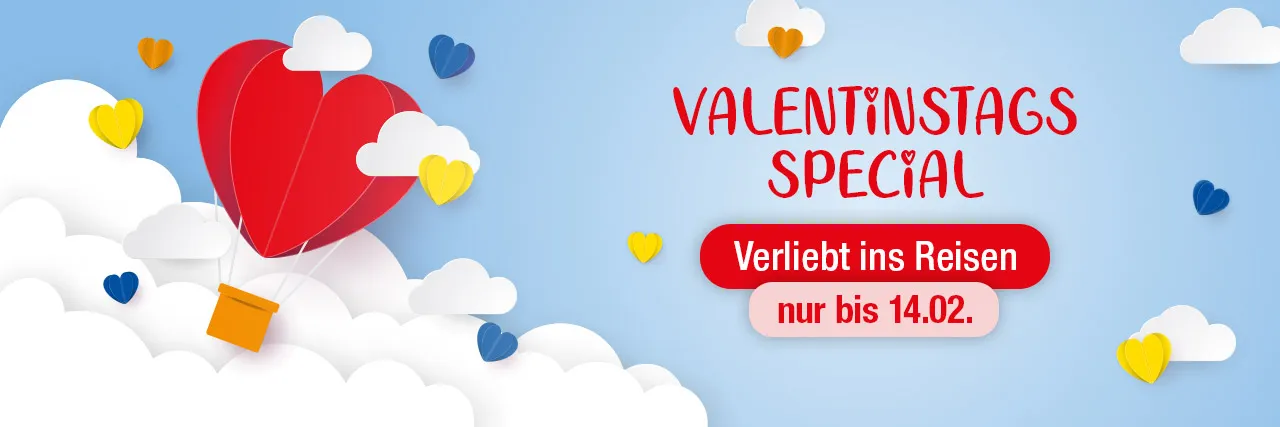 Und immer dran denken: Valentinstag ist am 14. Februar, dort endet auch unsere Aktion! Warten Sie nicht länger und buchen Sie jetzt Ihre Traumreise oder sichern Sie sich auch als Last-Minute-Geschenk einen unserer liebevoll gestalteten Gutscheine.